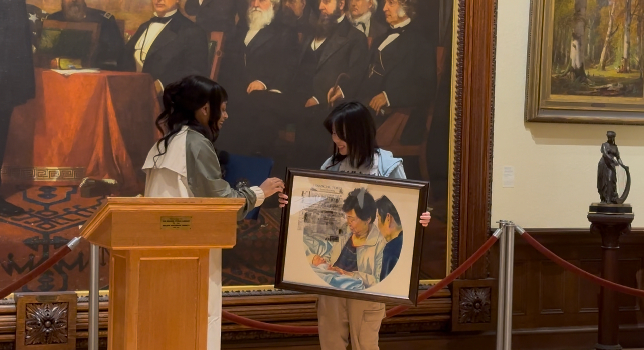 Freedom from Fear (April 24 2025) - Portrait of me when I was a baby. Memorial to my grandma and grandpa. Tape transfer of newspapers on top left. 2nd place Congressional Art Competition in MA 5th District.